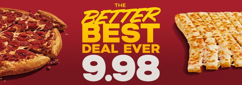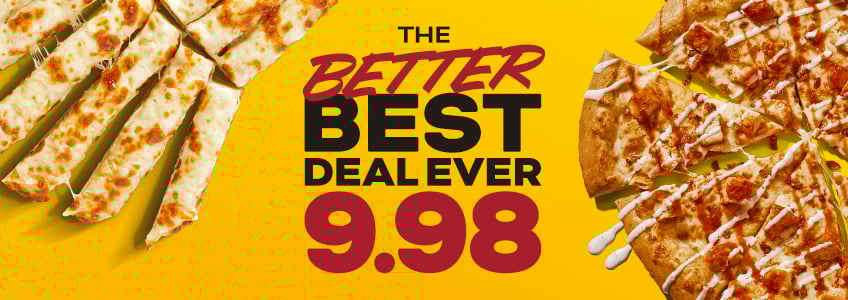 Get a Large House or 3-Topping Pizza or Triple Original Topperstix for just $9.98! Upgrade to Signature or Vegan Pizzas or Premium 'Stix for an additional charge.